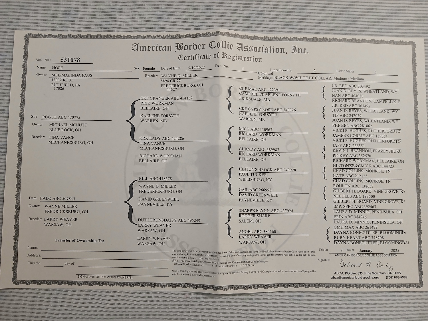 Sold Border Collie PupLitter born 1/17/25. One male pup available to working/trial home. Ready to go March 14, 2025. Will be vet checked and first shots given. Located in upstate NY. M. Mick’s Imp. Sylvie (sired by D. Jenkins Jock, OFA Hips Excellent, Wisdom DNA panel all clear) X J. Newcomb’s Hatchet (grandsire R. Hutchinson’s Jock, OFA Hips Excellent, Elbows Normal, DNA clear by parentage, works both sheep and cattle). Contact Maria Mick (Ad expires 03/15/2025) |