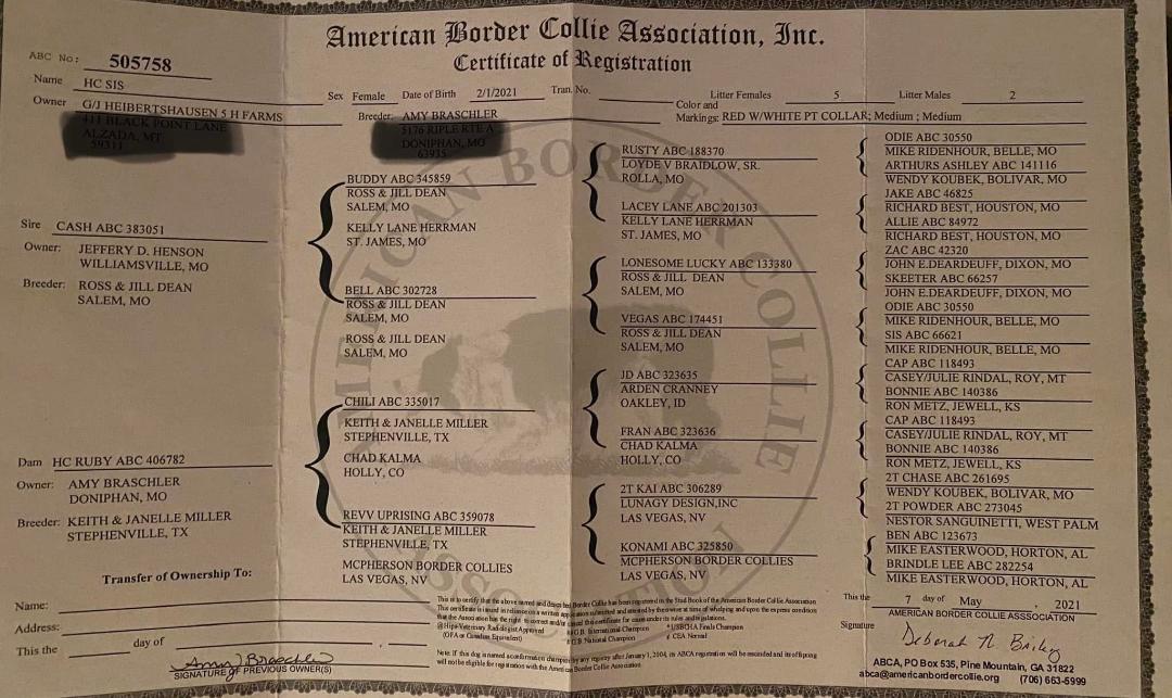 Sold Working Border Collie“Sam” is a 3 year old ISDS red/white male with an exceptional pedigree. Nice outruns, lifts, fetches and drives; works calmly in small pens and chutes. Located in southwest Missouri. Videos upon requests. Priced at $1500. Contact Pam Watson by phone/text at 417-328-8866. (Ad expires 08/19/2025) |