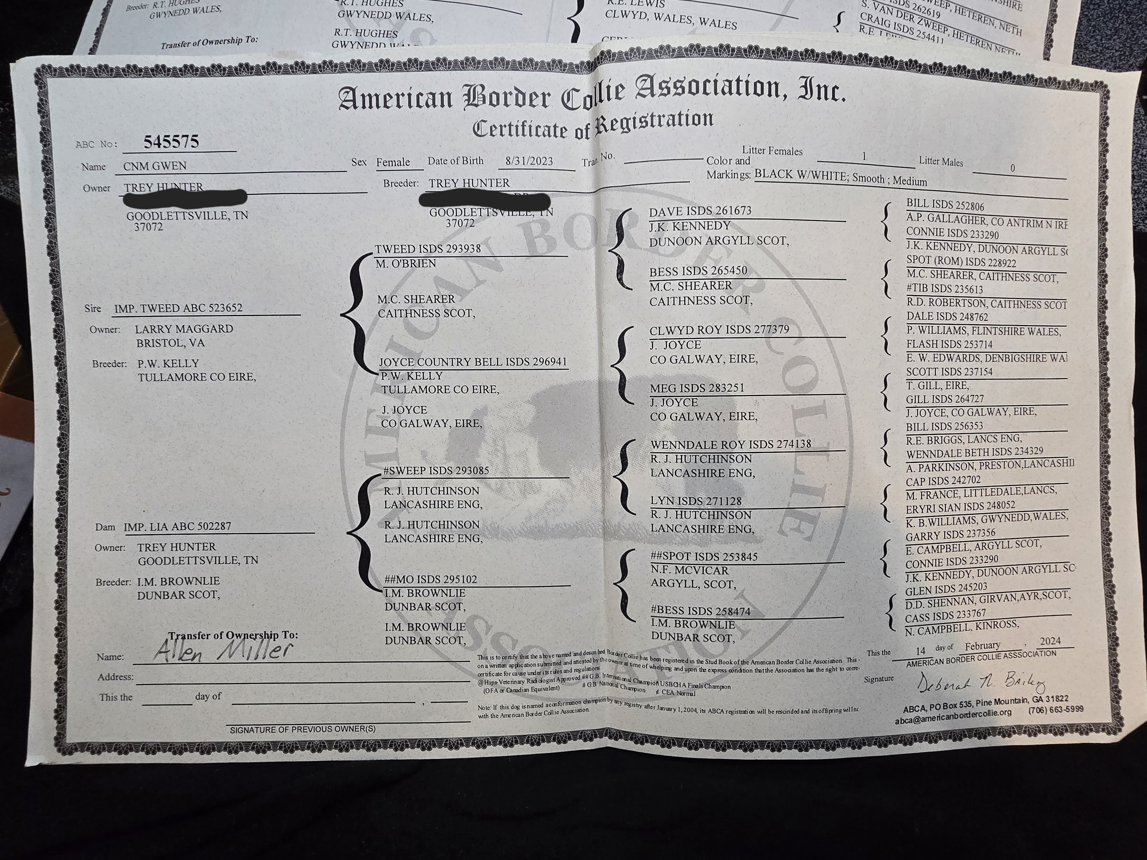 Sold Started Border Collie“Tippy-Dee” is a coming 2yo ABCA male. He has a wide vocabulary and knows here, lie down, there, away, comeby, walk, that’ll do, load up, kennel, place and I’m sure I’m forgetting some! Tippy knows his inside flanks as well and has started some driving as well as larger gathers. He’s a confident dog, not afraid to move sticky stock yet is gentle with the babies. He’s great on cattle as well as sheep, very soft flanks and stylish look to him. Just an amazing all around dog. Loves to play fetch and hang out with the family as well. Trained on voice and whistle. Priced at 6500 Located in Williston Fl Contact Anna Smith (Ad expires 06/04/2025) |